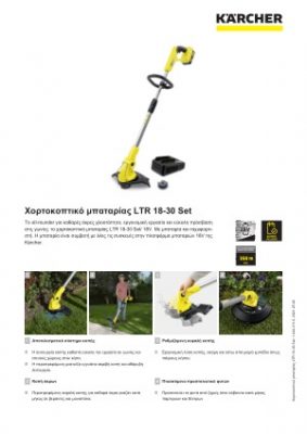 Το χορτοκοπτικό μπαταρίας LTR 18-30 Set/ 18V είναι ένα γνήσιο all-rounder. Με την περιστρεφόμενη μεσινέζα διευκολύνει την εργασία σε γωνίες και στενούς χώρους στον κήπο. Η μεσινέζα ρυθμίζεται πάντοτε στο τέλειο μήκος, χάρη στο χαρακτηριστικό αυτόματης ρύθμισης. Η λειτουργία κοπής άκρων εξασφαλίζει την καθαριότητα των φύλλων κοπής, καθαρές άκρες μαζί με τα μονοπάτια και τις αυλές. Η γωνία κλίσης είναι επίσης εύκολο να ρυθμιστεί για το κόψιμο του γρασιδιού κάτω από εμπόδια χαμηλής ανάρτησης. Η τυχαία ζημιά σε κοντινά λουλούδια και δέντρα παρεμποδίζεται με τη χρήση της πτυσσόμενης προστασίας φυτών. Τόσο η τηλεσκοπική χειρολαβή όσο και η ρυθμιζόμενη χειρολαβή για δύο χέρια εξασφαλίζουν εργονομική όρθια θέση εργασίας. Μία μπαταρία και ένας ταχυφορτιστής περιλαμβάνονται μαζί με τη συσκευή. Η μπαταρία είναι συμβατή με όλες τις συσκευές στην πλατφόρμα μπαταριών 18V της Kärcher.