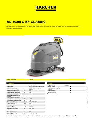 Karcher BD 50/60 C Classic Ep 1.127-002.0: Η compact BD 50/60 C Ep Classic προσφέρει μέγιστη απόδοση με τον ελάχιστο εξοπλισμό. Ο εξοπλισμός του μηχανήματος αποτελείται μόνο από τις βασικές λειτουργίες και ρυθμίσεις για αποδοτική χρήση. Το σύστημα λειτουργίας EASY καθιστά το μηχάνημα πολύ εύκολο στο χειρισμό. Αυτό το compact μηχάνημα είναι πολύ ευκίνητο και προσφέρει καλή ορατότητα. Όλα αυτά σε πολύ ελκυστική τιμή. Η BD 50/60 C Ep Classic είναι ιδανική για περιστασιακή αλλά και συχνή χρήση.