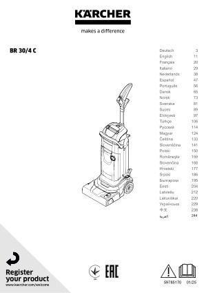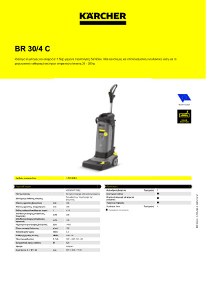 Karcher BR 30/4 1.783-220.0:Χάρη στην κάθετη σχεδίασή της, η μηχανή είναι ευκίνητη σαν μία σκούπα όρθιου τύπου. Σε σύγκριση με την κοινή σφουγγαρίστρα έχει μεγαλύτερη ισχύ καθαρισμού χάρη στην 10 φορές μεγαλύτερη πίεση που ασκεί στο δάπεδο με τη βούρτα που περιστρέφεται με 1500rpm. Η μηχανή στεγνώνει την επιφάνεια με μπροστινή και πίσω κίνηση. Για επίμονους ρύπους τα συστήματα αναρρόφησης μπορούν να ανασηκωθούν με τον ποδοδιακόπτη, ώστε το χημικό να δράσει για παραπάνω ώρα. Για εύκολο καθαρισμό κάτω από έπιπλα ή άλλα αντικείμενα χάρη στην χαμηλή κεφαλή.