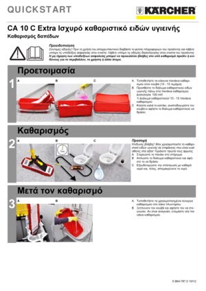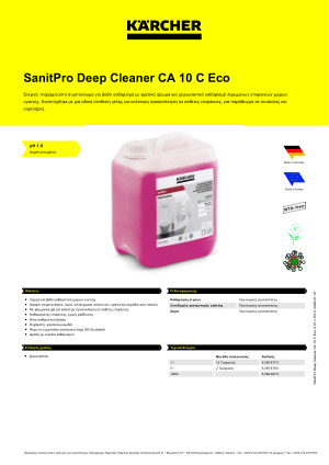 Karcher CA 10 C 1L 6.295-677.0: Ενεργό, παχύρρευστο συμπύκνωμα για βαθύ καθαρισμό με φρέσκο άρωμα για χειρωνακτικό καθαρισμό λερωμένων επιφανειών χώρων υγιεινής. Αναπτύχθηκε με μια ειδική σύνθεση γέλης για καλύτερη προσκόλληση σε κάθετες επιφάνειες, για παράδειγμα σε τουαλέτες και ουρητήρια.