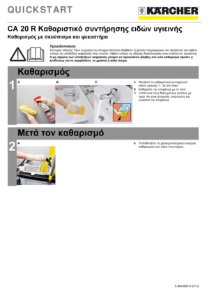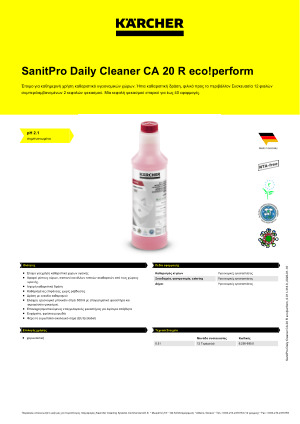 Karcher CA 20 R 500ml 6.295-685.0: Έτοιμο για χρήση καθαριστικό χώρων υγεινής. Ήπια καθαριστική δράση και φιλικό προς το περιβάλλον. Πακέτο 12 μπουκαλιών με 2 κεφαλές ψεκασμού. Έως 40 εφαρμογές ανά κεφαλή.
