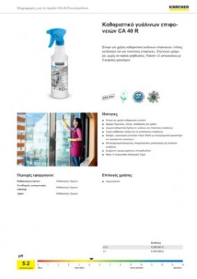 Karcher CA 40 R 500ml 6.295-687.0: Έτοιμο για χρήση καθαριστικό γυάλινων επιφανειών, επίσης κατάλληλο και για πλαστικές επιφάνειες. Στεγνώνει γρήγορα, χωρίς να αφήνει ραβδώσεις. Πακέτο 12 μπουκαλιών με 2 κεφαλές ψεκασμού.
