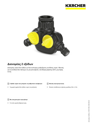 Karcher Διανομέας νερού δυο εξόδων 2.645-199.0: Υψηλής ποιότητας ρυθμιζόμενος διανομέας νερού 2 εξόδων με σύνδεσμο βρύσης G3/4 και μειωτήρα G1/2, για πότισμα με ένα ή δύο λάστιχα ταυτόχρονα. Ο διανομέας δύο εξόδων διαθέτει δύο συνδέσμους βρύσης με δύο ανεξάρτητα κομβία ελέγχου και προαιρετικό σύστημα παροχής νερού. Μπορεί να χρησιμοποιηθεί σε κάθε τύπου βρύσης με όλα τα standard λάστιχα κήπου και ξεχωρίζει χάρη στην άριστη ποιότητα και τον εργονομικό σχεδιασμό του, που παρέχουν άνετο και εύκολο χειρισμό. Διαθέτει σύνδεσμο με συμπαγές σπείρωμα για εύκολη σύνδεση στη βρύση.