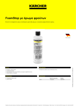 Karcher FoamStop Fruity 6.295-875.0: Αντιαφριστικό υγρό με άρωμα φρούτων χωρίς αλλεργιογόνα. Ο αφρός που μπορεί να δημιουργηθεί από υπολείμματα απορρυπαντικών στο δάπεδο, διασπάται γρήγορα με αυτό το υγρό αντιοξειδωτικό.