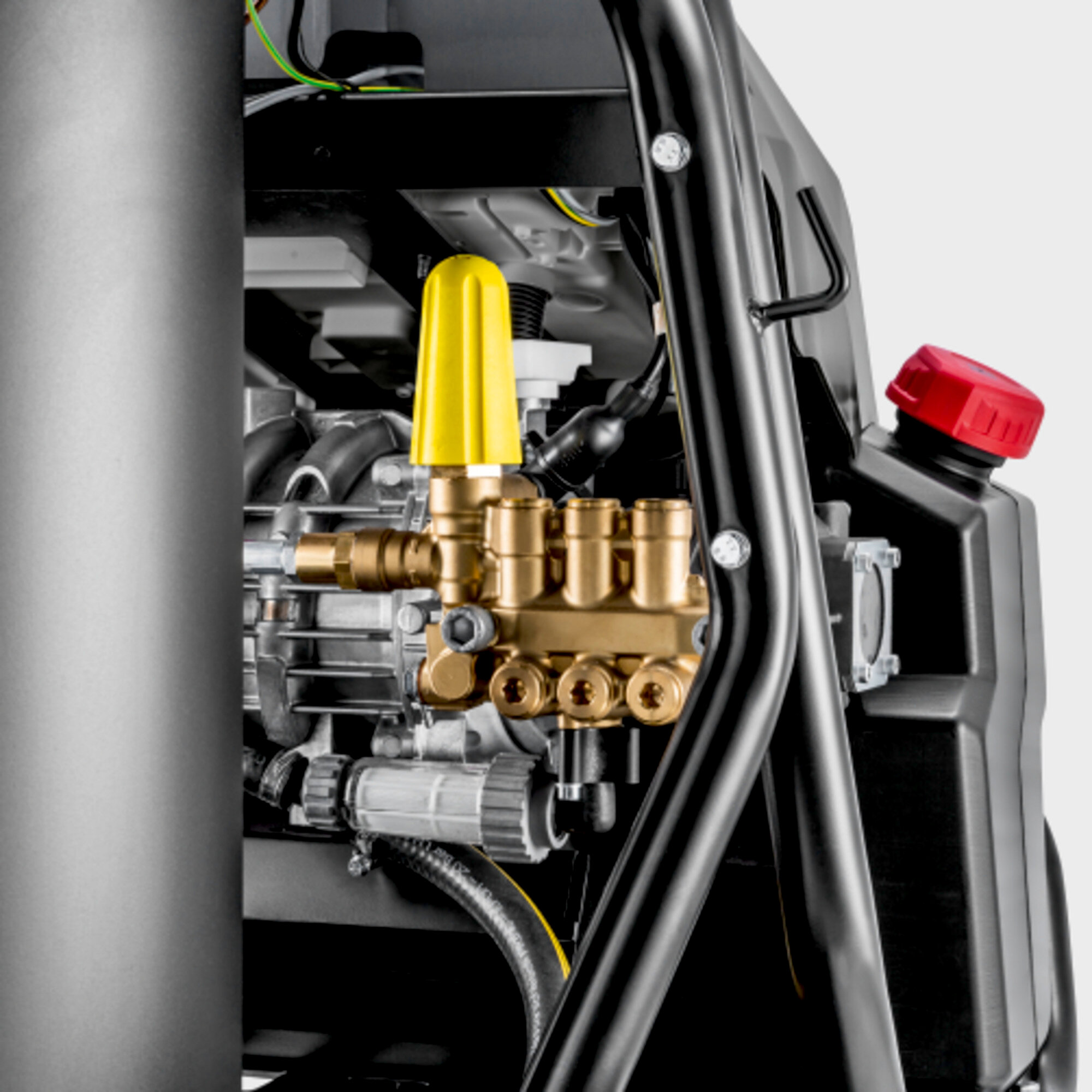 Στιβαρή αντλία στροφαλοφόρου άξονα με αποδεδειγμένη ποιότητα Kärcher. Δοκιμασμένη τεχνολογία ασφαλείας, όπως θερμική βαλβίδα ασφαλείας και φίλτρο νερού.