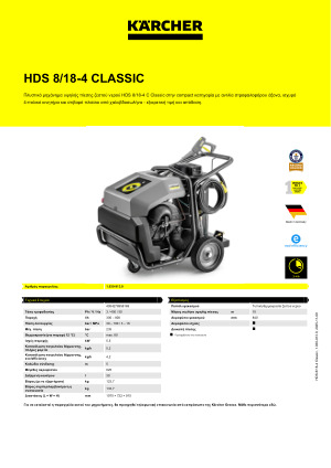 Karcher HDS 8/18-4 C Classic 1.030-913.0:Το HDS 8/18-4C είναι το πιο ισχυρό μηχάνημα υψηλής πίεσης ζεστού-κρύου νερού της σειράς Compact. Το τριφασικό μηχάνημα με τον τετραπολικό υδρόψυκτο κινητήρα προσφέρει ό,τι καλύτερο ως προς την ευκολία στη χρήση, την εργονομία και την αποτελεσματική διαχείριση των πόρων. Οι χρήστες θα εντυπωσιαστούν από χαρακτηριστικά, όπως η λειτουργία ενός κουμπιού και από την υψηλή ευελιξία που επιτυγχάνεται χάρη στους μεγάλους τροχούς και το κυλινδρικό τιμόνι. Με το πιστόλι υψηλής πίεσης EASY!Force, χρησιμοποιείται η δύναμη ανάκρουσης της κάνης υψηλής πίεσης και μειώνεται στο μηδέν η δύναμη συγκράτησης για το χειριστή, ενώ με τους ταχυσυνδέσμους EASY!Lock η σύνδεση γίνεται πέντε φορές ταχύτερη σε σχέση με τις συμβατικές συνδέσεις και είναι πιο άνετη στη χρήση, χωρίς να χάνεται η στιβαρότητα ή η διάρκεια ζωής του μηχανήματος. Το ανθεκτικό σασί εξασφαλίζει βέλτιστη ασφάλεια, καθώς οι δεξαμενές για τα καθαριστικά και τα καύσιμα είναι πλήρως απομονωμένες. Εύχρηστοι αποθηκευτικοί χώροι για τα αξεσουάρ και τα εργαλεία ολοκληρώνουν την ευρεία γκάμα των χαρακτηριστικών που προσφέρει το HDS 8/18-4 C.