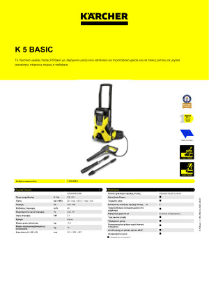 Karcher K 5 Basic 1.180-580.0 :Το πλυστικό υψηλής πίεσης K5 Basic με υδρόψυκτο μοτέρ είναι κατάλληλο για περιστασιακή χρήση και για ήπιους ρύπους σε μεγάλα αυτοκίνητα, πέτρινους τοίχους ή ποδήλατα.
