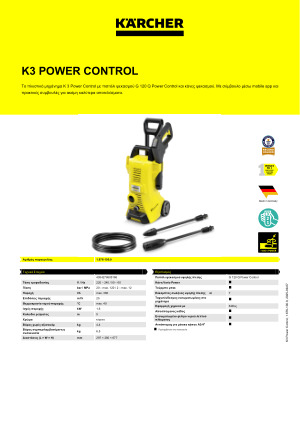 Karcher K 3 Power Control 1.676-100.0: Με τον πρακτικό σύμβουλο εφαρμογής στην εφαρμογή Home & Garden, η οποία υποστηρίζει το πλυστικό μηχάνημα K 3 Power Control, η Kärcher επιτρέπει ακόμη καλύτερα αποτελέσματα καθαρισμού – και κάνει τον χρήστη ειδικό στον καθαρισμό. Η εφαρμογή προσφέρει επίσης μια ολοκληρωμένη υπηρεσία με πληροφορίες για τη συσκευή, την εφαρμογή και την πύλη Kärcher Service. Το κατάλληλο επίπεδο πίεσης για την εφαρμογή ρυθμίζεται στην κάνη ψεκασμού και ελέγχεται στην οθόνη του πιστολιού G 120 Q Power Control – για μέγιστο έλεγχο και ιδανική πίεση για κάθε επιφάνεια. Η εναλλαγή από τη λειτουργία υψηλής πίεσης στη λειτουργία ψεκασμού γίνεται χωρίς να αντικαθίσταται η κάνη. Το απορρυπαντικό εφαρμόζεται γρήγορα, απλά και άνετα από το ενσωματωμένο δοχείο απορρυπαντικού. Το K 3 Power Control της Kärcher εντυπωσιάζει επίσης με μια τηλεσκοπική λαβή για άνετη μεταφορά και αποθήκευση, βάση για μεγαλύτερη σταθερότητα, στηρίγματα για εξαρτήματα και καλώδιο, καθώς και το σύστημα ταχυσυνδέσμου της Kärcher. Η βάση χρησιμοποιείται και ως δεύτερη λαβή μεταφοράς, διευκολύνοντας την ανύψωση της συσκευής σε ράφι ή τη φόρτωσή της στο πορτμπαγκάζ.