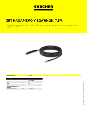 Karcher Κιτ απόφραξης 7,5m 2.637-729.0: Σετ καθαρισμού σωληνώσεων με εύκαμπτο σωλήνα 7,5 m για τον καθαρισμό των αποφραγμένων σημείων σε σωληνώσεις, αποχετεύσεις, υδρορροές και τουαλέτες. Τέσσερις δέσμες αντίστροφης εκτόξευσης κατευθύνουν τον εύκαμπτο σωλήνα ομαλά μέσα στις σωληνώσεις και καθαρίζουν το αποφραγμένο σημείο. Η συνεχής σήμανση και ο δακτύλιος σήμανσης δείχνουν την πρόοδο στη σωλήνωση. Εύκαμπτος σωλήνας υψηλής ποιότητας 7,5 m, με υφασμάτινη πλέξη και πολύ κοντό ορειχάλκινο ακροφύσιο για εύκολη κίνηση μέσα στις σωληνώσεις. Με χιτώνιο κατά της συστροφής και ορειχάλκινο σύνδεσμο για ανθεκτικότητα. Κατάλληλος για χρήση στο σπίτι και τους εξωτερικούς χώρους με όλα τα πλυστικά μηχανήματα υψηλής πίεσης οικιακής χρήσης Kärcher των σειρών K2 – K7.