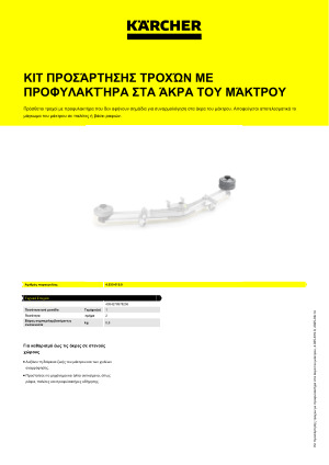 Karcher Κιτ προφυλακτήρα σκουίτζι 4.035-619.0: Ειδικά σχεδιασμένο κιτ προσάρτησης με πρόσθετους τροχούς και προφυλακτήρα για μηχανήματα πλύσης-στέγνωσης, τα οποία χρησιμοποιούνται συχνά σε δύσκολες συνθήκες, όπως συμβαίνει σε στενούς χώρους με πυκνή επίπλωση σε σούπερ μάρκετ, καθώς και για καθαρισμό κοντά σε άκρες εμποδίων και τοίχων, π.χ. σε αίθουσες παραγωγής ή αποθήκες. Χαρακτηριστικά παραδείγματα είναι τα ανυψωμένα ράφια, οι παλέτες ή ακόμα και οι ράγες-οδηγοί όπου ενδέχεται να υπάρχει κίνδυνος μαγκώματος ή σύγκρουσης του μάκτρου. Για να ελαχιστοποιηθεί ο κίνδυνος αυτός, η Kärcher προτείνει τη χρήση αυτών των πρόσθετων τροχών με προφυλακτήρα που δεν αφήνουν σημάδια. Αυτοί οι τροχοί του βασικού εξοπλισμού με προφυλακτήρα τοποθετούνται πολύ εύκολα στα άκρα του μάκτρου. Το ύψος του μάκτρου στα άκρα του αυξάνεται περίπου στα 15 εκατοστά, γεγονός που βοηθά να αποφεύγεται η πρόκληση ζημιών στο μηχάνημα, αλλά και στο εμπόρευμα.