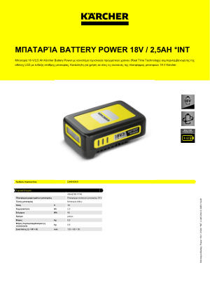 Karcher Μπαταρία 18V / 2,5Ah 2.445-034.0: Mπαταρία 18 V/2,5 Ah Kärcher Battery Power με καινοτόμο τεχνολογία πραγματικού χρόνου (Real Time Technology) συμπεριλαμβανομένης της οθόνης LCD με ένδειξη στάθμης μπαταρίας. Κατάλληλη για χρήση σε όλες τις συσκευές της πλατφόρμας μπαταριών 18 V Kärcher.