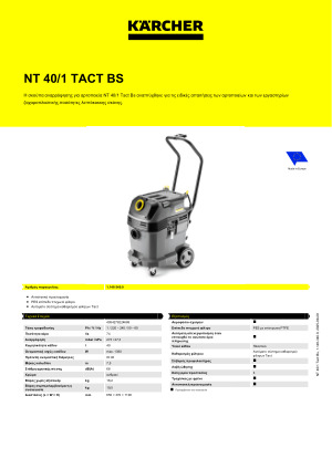 Karcher NT 40/1 Tact Bs 1.148-340.0 Η σκούπα αναρρόφησης για αρτοποιεία αναπτύχθηκε για τις ειδικές απαιτήσεις των αρτοποιείων και των εργαστηρίων ζαχαροπλαστικής.ποσότητες λεπτόκοκκης σκόνης.