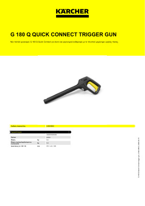 Karcher Πιστόλι Quick Connect 2.642-889.0: Το πιστόλι ψεκασμού G 180 Q προσφέρει μεγαλύτερη άνεση κατά τη χρήση χάρη στον βελτιωμένο σχεδιασμό του. Χάρη στον βελτιστοποιημένη κατασκευή του πιστολιού, ο εργονομικός καθαρισμός γίνεται πιο εύκολος από ποτέ. Για ακόμη πιο αποδοτικό καθαρισμό, το απορρυπαντικό μπορεί να εφαρμόζεται απευθείας μέσω του πιστολιού, εφόσον το πλυστικό μηχάνημα διαθέτει είσοδο απορρυπαντικού. Το κλείδωμα ασφαλείας για παιδιά επιτρέπει την εύκολη ασφάλιση της σκανδάλης, ενώ ο πρακτικός αντάπτορας Quick Connect διευκολύνει τη γρήγορη σύνδεση του σωλήνα υψηλής πίεσης. Το πιστόλι ψεκασμού είναι κατάλληλο για όλα τα πλυστικά μηχανήματα Kärcher των κατηγοριών K 2 έως K 7.
