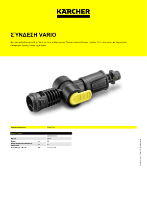Karcher Ρυθμιζόμενος σύνδεσμος 2.640-733.0:Σύνδεση Vario, περιστρέφεται κατά 180° για τον καθαρισμό δυσπρόσιτων σημείων, π.χ. κυλιόμενα ρολά, οροφές αυτοκινήτων ή σπιτάκια κήπου. Σύνδεση: Για σύνδεση του πιστολιού και του εξαρτήματος ή της κάνης προέκτασης και του εξαρτήματος. Η σύνδεση Vario επιτρέπει τον εργονομικό καθαρισμό.