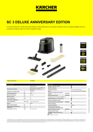 Karcher SC3 Deluxe Anniversary Edition 1.513-436.0 : Το SC 3 Deluxe Anniversary Edition, για τον εορτασμό της 90ής επετείου της εταιρείας, είναι μια περιορισμένη έκδοση χρώματος με ειδικά αξεσουάρ. Ο ατμοκαθαριστής είναι έτοιμος για έναρξη μετά από χρόνο προθέρμανσης μόλις 30 δευτερολέπτων και εξαλείφει έως και 99,999% των ιών* και 99,99% όλων των κοινών οικιακών βακτηρίων** σε σκληρές επιφάνειες. Το ακροφύσιο δαπέδου EasyFix με εύκαμπτη άρθρωση προσφέρει εξαιρετική εργονομία και τέλεια αποτελέσματα καθαρισμού. Το επιπλέον εύκαμπτο ακροφύσιο χειρός επιτρέπει τον λεπτομερή και άνετο καθαρισμό τόσο των επίπεδων όσο και των καμπύλων λείων επιφανειών ασκώντας απαλή πίεση μαζί με το υψηλής ποιότητας πανί μικροϊνών, ακόμη και σε περίπτωση επίμονης βρωμιάς. Η ρύθμιση ατμού δύο σταδίων εγγυάται ότι η ροή ατμού προσαρμόζεται τέλεια στην επιφάνεια και το επίπεδο βρωμιάς κάθε φορά. Το διαμέρισμα αξεσουάρ στην ίδια τη συσκευή παρέχει έναν απλό και ασφαλή τρόπο αποθήκευσης αξεσουάρ, καλωδίων και σωλήνων. Άλλα χαρακτηριστικά περιλαμβάνουν μια ενσωματωμένη κασέτα αφαλάτωσης, μια δεξαμενή νερού που μπορεί να ξαναγεμιστεί όποτε χρειάζεται για αδιάλειπτο καθαρισμό και μια λωρίδα φωτός LED για ένδειξη των λειτουργιών.