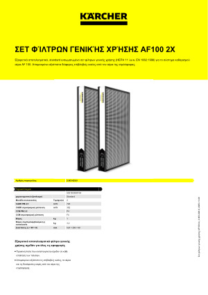 Karcher Σετ φίλτρων AF100 2.863-029.0: Το σετ φίλτρων γενικής χρήσης (HEPA 11 i.a.w. EN 1882:1998) περιλαμβάνεται ήδη με την αγορά του συστήματος καθαρισμού αέρα της Kärcher AF 100. Το φίλτρο γενικής χρήσης απομακρύνει διάφορες επιβλαβείς ουσίες που βρίσκονται στον αέρα, και φιλτράρει τα αέρια και τις δυσάρεστες οσμές από τους εσωτερικούς χώρους χάρη στον φυσικό ενεργό άνθρακα που περιέχει, και, κατά συνέπεια, βελτιώνει σημαντικά την ποιότητα του αέρα μακροπρόθεσμα. Είναι διαθέσιμα και άλλα φίλτρα για το σύστημα καθαρισμού του αέρα που ανταποκρίνονται σε ειδικές απαιτήσεις.