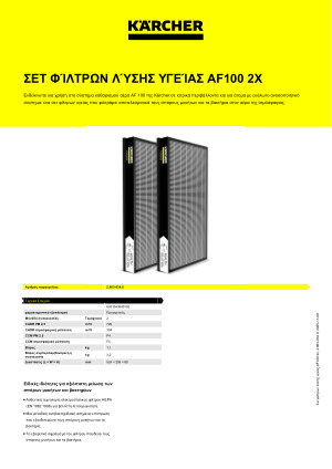 Karcher Σετ φίλτρων AF100 Λύσης υγείας 2.863-034.0: Το φίλτρο υγείας (φίλτρο HEPA 11 σύμφωνα με το πρότυπο EN 1882:1998) για το σύστημα καθαρισμού του αέρα AF 100 της Kärcher διαθέτει μια αποτελεσματική αντιβακτηριδιακή ασημένια επίστρωση για την εξάλειψη των σπόρων μυκήτων και των βακτηρίων από τον αέρα της ατμόσφαιρας. Επιπλέον, αποτρέπεται η εξάπλωση των σωματιδίων αυτών στους εσωτερικούς χώρους, ενώ αποτελεί ιδανική επιλογή για χρήση σε ιατρεία, σε χώρους όπου υπάρχουν άτομα με ευάλωτο ανοσοποιητικό σύστημα (π.χ. άτομα που έχουν υποβληθεί σε εγχείριση) ή απλώς για γενική χρήση σε γραφεία σε κατά την εποχή της γρίπης και του κρυολογήματος. Για οποιεσδήποτε άλλες ειδικές απαιτήσεις, διατίθενται επιπλέον φίλτρα για το σύστημα καθαρισμού του αέρα.