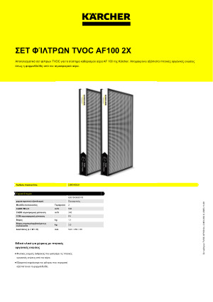 Karcher Σετ φίλτρων AF100 TVOC 2.863-032.0: Το φίλτρο TVOC για το σύστημα καθαρισμού του αέρα AF 100 της Kärcher χρησιμοποιείται αμέσως μετά το βάψιμο και την επίπλωση ενός δωματίου, καθώς απομακρύνει αξιόπιστα τα επιβλαβή αέρια από τον αέρα της ατμόσφαιρας. Σε αυτά τα αέρια συγκαταλέγεται και η φορμαλδεΰδη, η οποία κατατάσσεται στην κατηγορία 1Β ως «δυνάμενη να προκαλέσει καρκίνο» από το Ομοσπονδιακό Υπουργείο Περιβάλλοντος των ΗΠΑ, και γενικά συναντάται στο πλαστικό, τα έπιπλα, τις επιστρώσεις δαπέδων, τα απολυμαντικά και τα υφάσματα. Επιπλέον, ενδείκνυται για χρήση σε γραφεία τα οποία διαθέτουν υπερβολικά πολλά φωτοτυπικά μηχανήματα και εκτυπωτές. Τα φίλτρα μας διατίθενται για το σύστημα καθαρισμού του αέρα για λοιπές ειδικές απαιτήσεις.
