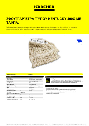 Karcher Σφουγγαρίστρα τύπου Kentucky με ταινία 6.999-358.0: Δοκιμασμένο, απλό στη χρήση και εξαιρετικά αποτελεσματικό: το σύστημα σφουγγαρίσματος με αποσπώμενη βάση σφουγγαρίσματος τύπου Kentucky και ταινία από την Kärcher. Η ταινία εξασφαλίζει ότι η σφουγγαρίστρα διατηρεί το σχήμα της κατά το πλύσιμο, παρατείνοντας έτσι τη διάρκεια ζωής της. Η φιλική προς το περιβάλλον σφουγγαρίστρα τύπου Kentucky, κατασκευασμένη από φυσικά υλικά, απορροφά πολύ καθαριστικό διάλυμα, καθιστώντας την ιδανική για τον καθαρισμό ανώμαλων επιφανειών και την απομάκρυνση υπολειμματικών ρύπων. Οι ιδιότητες αυτές αναδεικνύονται επίσης σε χώρους με πολλά εμπόδια.