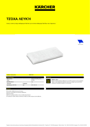 Karcher Τσόχα λευκή 6.999-102.0: Η λευκή τσόχα καθαρισμού είναι εξαιρετικά ευέλικτη και, χάρη στο συμπαγές μέγεθός της, ιδιαίτερα κατάλληλη για τον απαλό εντατικό καθαρισμό δαπέδων και επιφανειών που δεν είναι προσβάσιμες από τα μηχανήματα καθαρισμού. Για τον καθαρισμό δαπέδων, συνιστούμε τη χρήση με τη συμβατή βάση για τσόχες με λαβή και άρθρωση, καθώς και τη βάση για τσόχες Kärcher με λαβή για χειροκίνητη χρήση σε επιφάνειες. Η τσόχα από ύφασμα fleece με μαλακό λειαντικό κόκκο είναι επίσης κατάλληλη για τον καθαρισμό επιφανειών και αντικειμένων, για παράδειγμα, από ανοξείδωτο χάλυβα, χρώμιο, χαλκό, πορσελάνη ή κεραμικό. Για το εργαλείο χειρός για τσόχες 6.999-101.0 και το εργαλείο χειρός με σύνδεση για κοντάρι με κωδικό 6.999-158.0.