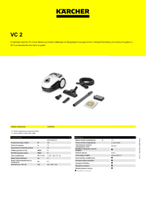 Karcher VC 2 Σκούπα 1.198-035.0 : Η ηλεκτρική σκούπα VC 2 της Kärcher εντυπωσιάζει με το υγιεινό και άνετο σύστημα φίλτρου: Η σακούλα μπορεί να αφαρεθεί εύκολα, χωρίς να έρχεσαι σε επαφή με τη σκόνη. Αυτή η compact σκούπα αναρρόφησης προτείνεται για χρήση σε διαμερίσματα και μικρά σπίτια. Ιδανική για βαθύ καθαρισμό σκληρών δαπέδων και χαλιών. Το ακροφύσιο για γωνίες και η βούρτσα για τα έπιπλα κάνουν ακόμη πιο εύκολο τον καθαρισμό σε στενά σημεία και ευαίσθητες επιφάνειες. Ένα άλλο πλεονέκτημα της VC 2 είναι το φίλτρο HEPA, το οποίο φιλτράρει του ρύπους όπως η γύρη ή άλλα αλλεργιογόνα. Το ολοκληρωμένο σύστημα εξαρτημάτων, η αναρροφητική ισχύς και η πρακτική θέση parking κάνουν τη σκούπα αναρρόφησης ακόμη πιο άνετη στη χρήση.