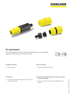 Karcher Σετ ψεκασμού 2.645-288.0: Το τέλεια συντονισμένο ακροφύσιο για τον κήπο σας. Το ακροφύσιο (2.645-64.0) είναι ιδανικό για απλές εργασίες ποτίσματος. Χάρη στις συνεχώς ρυθμιζόμενες επιλογές ψεκασμού, η διανομή του νερού μπορεί να εναλλάσσεται μεταξύ κωνικής δεσμης και δέσμης σημείο, εάν χρειάζεται. Μπορεί να χρησιμοποιηθεί τόσο για το πότισμα, όσο καο για την απομάκρυνση ρύπων γύρω από τον κήπο. Όταν το ακροφύσιο δεν χρησιμοποιείται, η ροή του νερού στο ακροφύσιο ψεκασμού μπορεί να κλείσει. Το σετ ακόμη περιλαμβάνει ένα σύνδεσμο βρύσης G3/4” και έναν μειωτήτα G1/2”, καθώς και δυο ισχυρούς συνδέσμους γενικής χρήσης – ο ένας με Aqua Stop. Αυτό αποτρέπει τη ροή του νερού στο τέλος του λάστιχου, ακόμη και όταν η βρύση είναι ανοιχτή, για παράδειγμα όταν έχει αφαιρεθεί το ακροφύσιο. Οι σύνδεσμοι μπορούν ακόμη να χρησιμοποιηθούν με όλες τις συμβατικές διαμέτρους λάστιχων. Επιπλέον, τα ακροφύσια και οι σύνδεσμοι της Kärcher είναι συμβατά με όλα τα διαθέσιμα συστήματα click και μπορούν να συνδεθούν στα λάστιχα το κήπου, χωρίς προβλήματα.